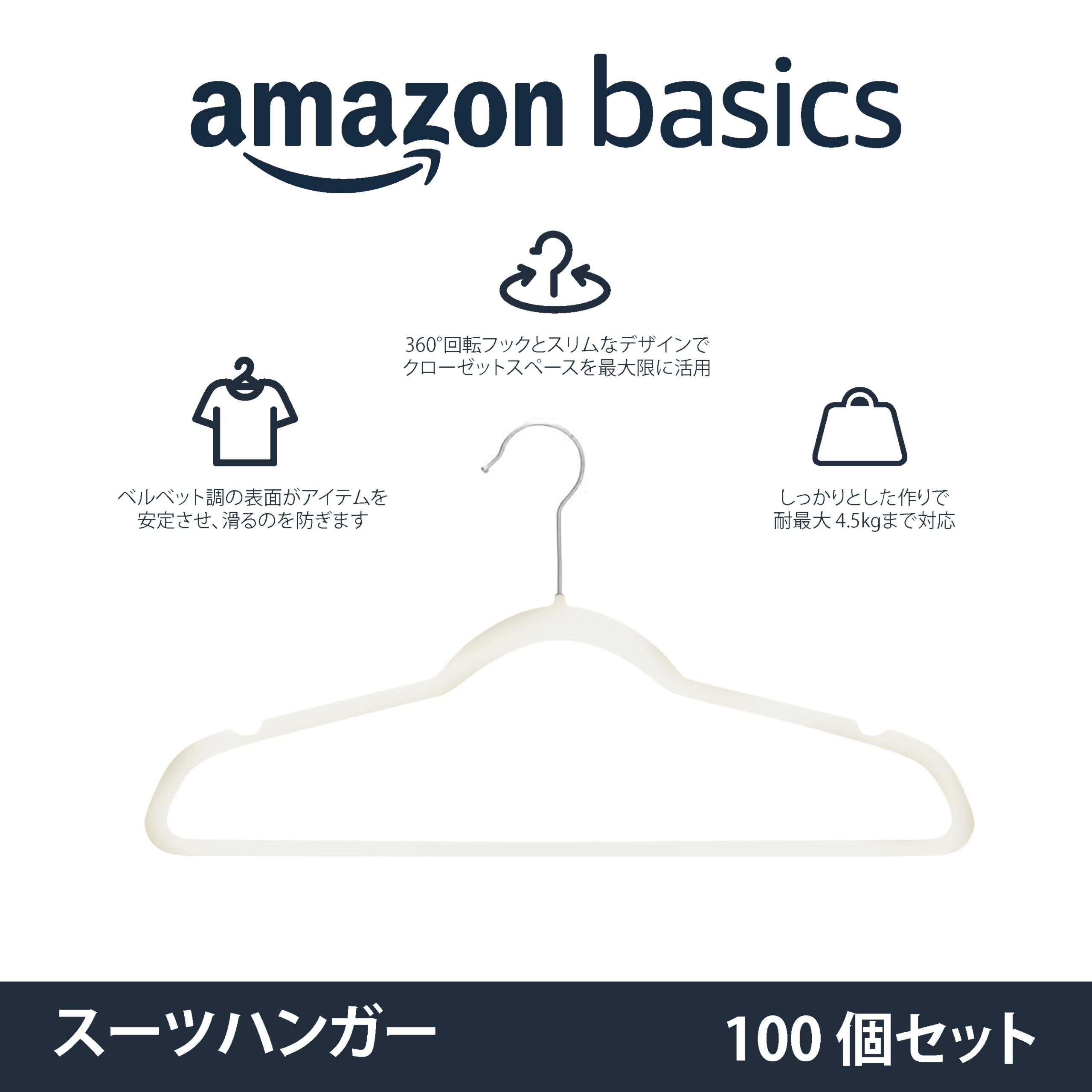 Amazonベーシック ハンガー 100本組 滑らない かたくずれ防止 ベルベット製 アイボリー