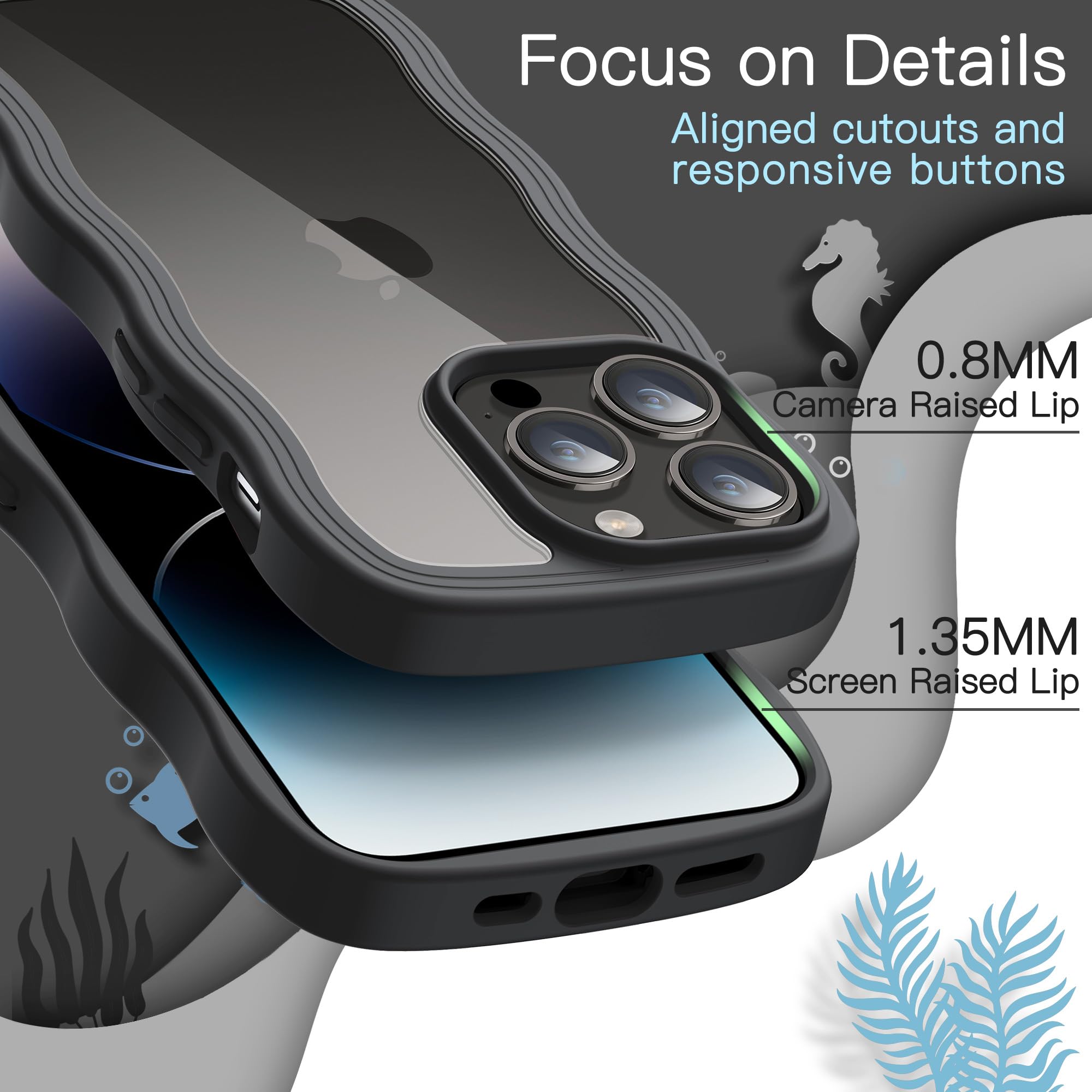 JETech iPhone 14 Pro 6.1インチ用 かわいい ケース 波状フレーム うねうね 耐衝撃 スマホカバー 女性用 女子向け クリア ハードPCバック (ブラック)