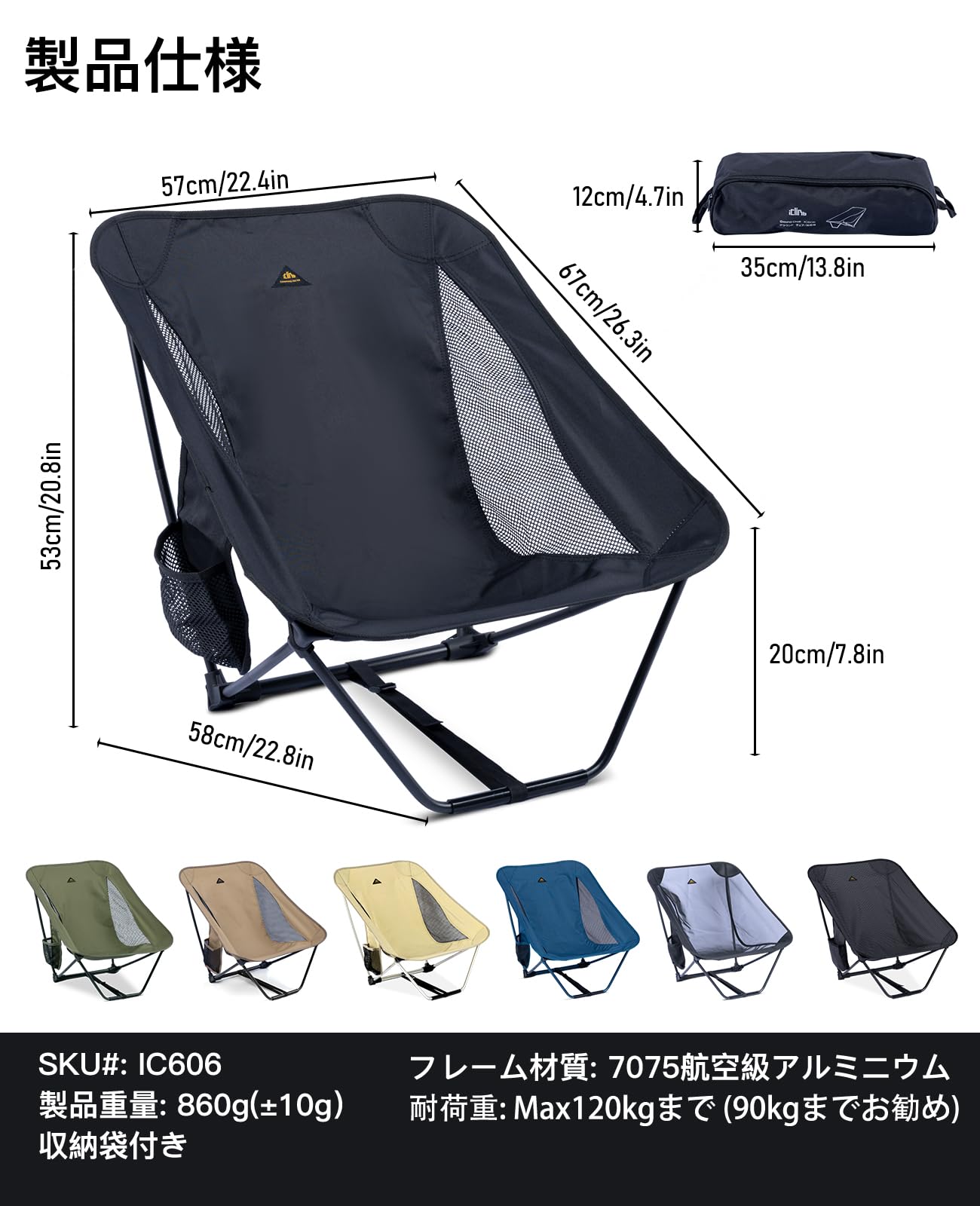 【組立簡単、ディテール重視】組立と撤収が簡単です、詳細は商品写真欄または商品紹介ページに組立、撤収、ストラップ取り付ける方法の紹介ビデオが付いてます、是非ご参照ください。もっと細かいところ:前足フレームに滑り防止、傷防止のゴムカバー、後足フレームに滑り止め脚が付いてます。鍵、缶コーヒー等小物を入れるサイドポケットもあり、小物の収納が簡単です。