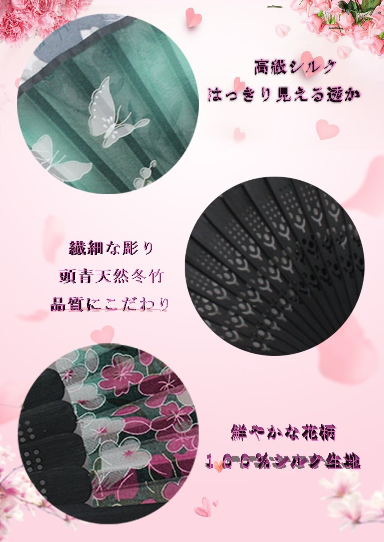 素材:「扇面」高級シルク100%/「骨組」天然竹製使用 はっきり見える透かし、きめが細かく張りのある美しいシルクです。
