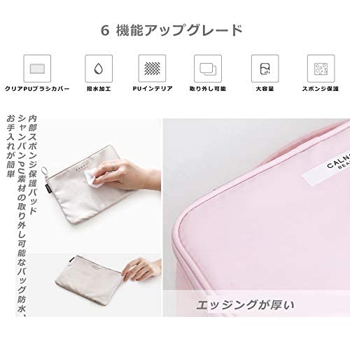 【ブラシカバー付き】チークブラシやスティックコスメに便利な収納ポケット6つ付き。ブラシの粉汚れも飛び散らずに収納できるビニール透明カバー付き。汚れもさっと拭き取れる。【フリーポケット×1】ファンデーションや手鏡などのスリムな小物の収納に便利なフリーポケット付き。【持ち手ハンドル付き】持ち運びしやすいハンドル付き。出先でもさっと持ち運べる。【ミニポーチ】取り外し可能のミニポーチ付き。
