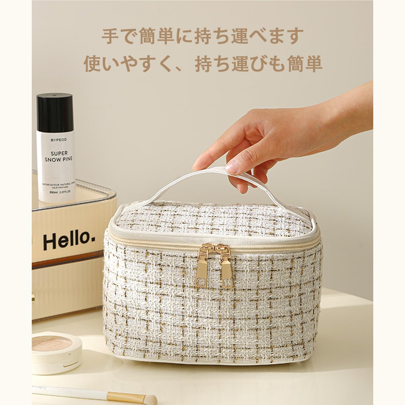 【快適な持ち運び】手提げのデザインは、メイクポーチを快適に持ち運ぶことができます。旅行や出張の際にも便利です。