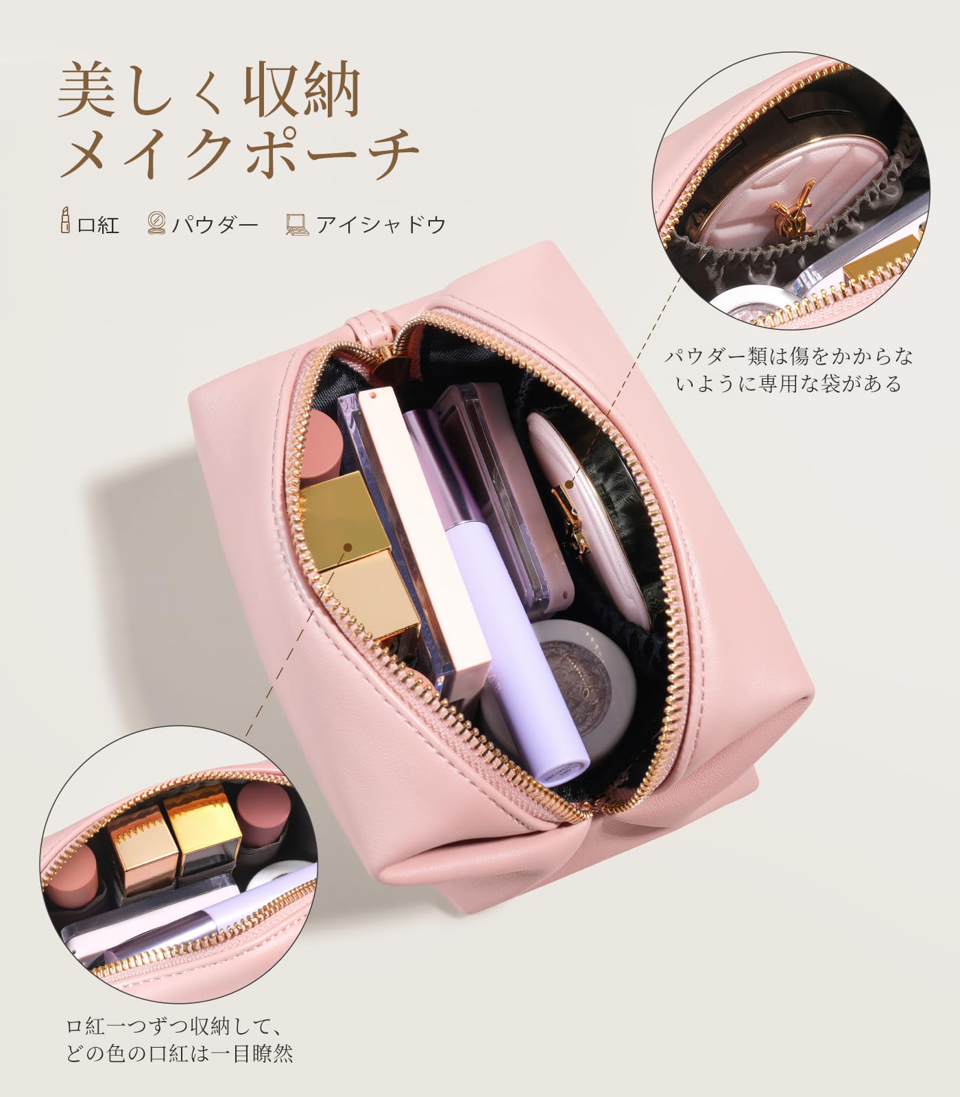 Rownyeon メイクポーチ 持ち運び リボン かわいい コンパクト 仕切りたくさん 化粧ポーチ 韓国風 防撥水 PU 小物入れ ミニ 小さめ ピンク 誕生日贈り物 ギフト