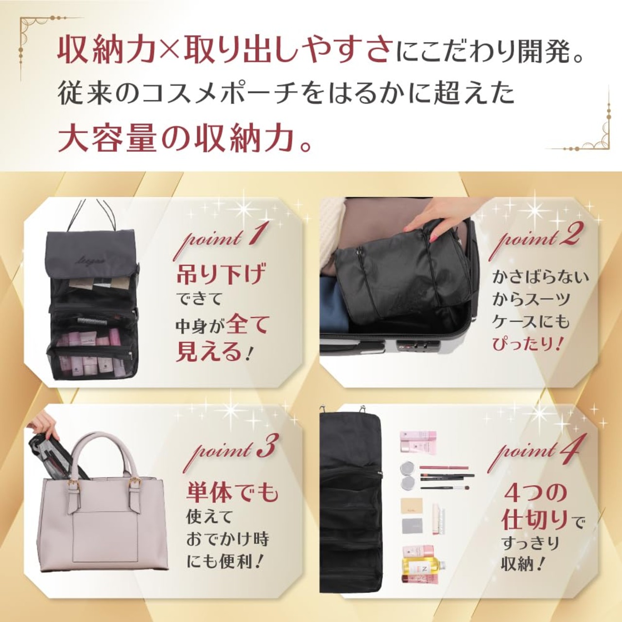 メイクポーチ トラベルポーチ 大容量 【現役モデル&美容専門家監修】【信頼の日本ブランド】 化粧ポーチ コスメポーチ 便利グッズ 旅行 防水 折りたたみ 吊り下げ 化粧品バッグ 収納バッグ (ブラック)