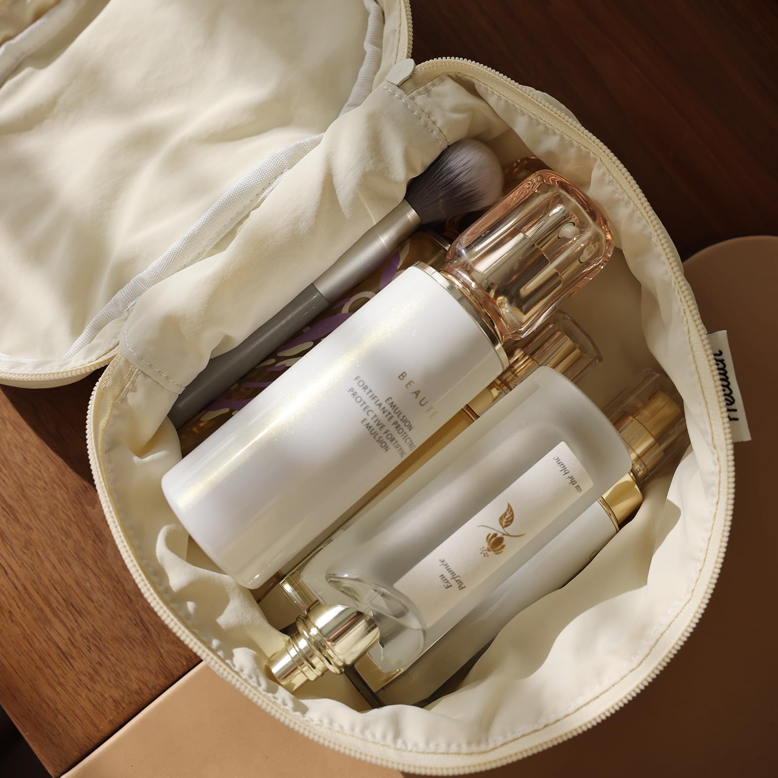 【大きな開口部】開口部が大きく開くジッパーを採用しているため、フラップを裏返して使うことができ、アイテムの出し入れが簡単にできます。ポーチのボディは円筒形デザインで、さまざまなスキンケア製品やメイクアップ製品を縦向きに収納でき、中身を衝突や傷から守ります。