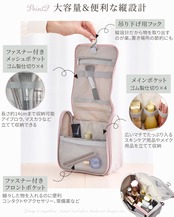 【大容量&軽量&使いやすい縦設計】旅行に必要な洗面道具やコスメ類を一式収納。立てる収納なので仕分けがしやすく容量もたっぷり。細々としたものも整理して入れられる機能が充実。高さがある化粧水等も入るので、いつも使用しているコスメを入れ替えずそのまま持ち歩きできます。マチがありプラスチックのワイヤー入りなので、軽量だけどしっかり自立、安定感があり型崩れしにくいデザイン。クッション材内蔵、大切なコスメを衝撃から保護します。