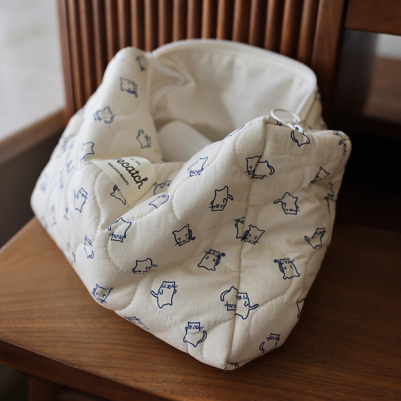 開口部が大きく開くジッパーとキルティングのデザインが、雲のようにふわふわとしたトーストのように柔らかな化粧ポーチをより特別なものにしています。コットン生地は自在に折りたたむことができ、シワがつきにくいのが特徴です。大きめにデザインしており、化粧品だけでなく、赤ちゃんのおむつなどの雑貨も収納できます。