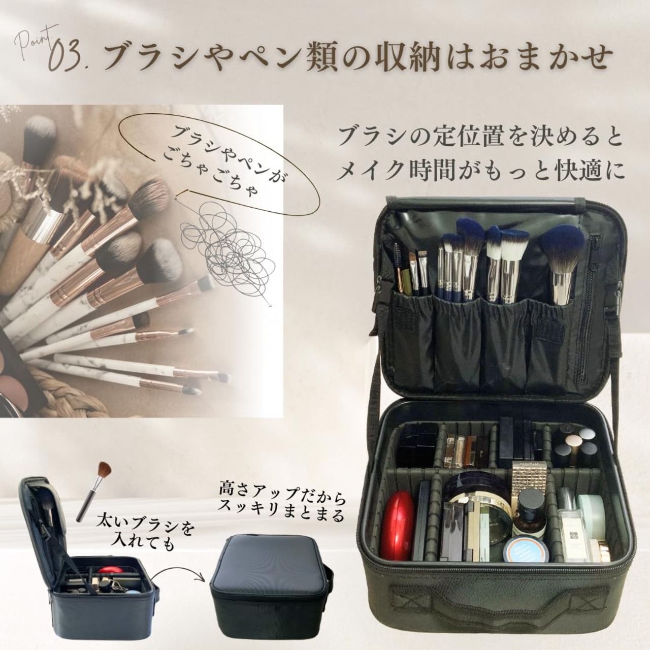 【まるでプロ!】ブラシやペン類などを並べて清潔に取り出しやすく収納できます。