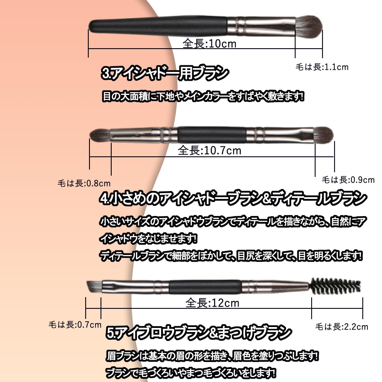【製品詳細】5本セット:ファンデーションブラシ、パウダーブラシ、チークブラシ、アイシャドウブラシ、スクリューブラシ & 斜アイブロウブラシがある。日常メイクに必要なブラシが全て揃っている。デートやオフィスメイクなどあらゆるシーンのメイクをすることができます。