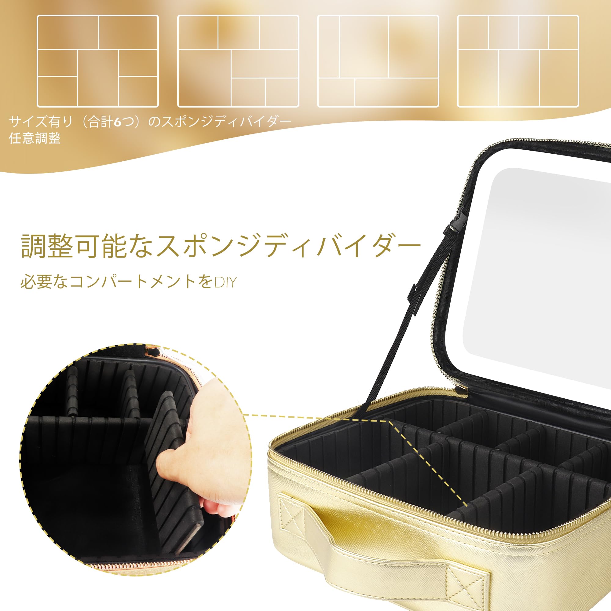 MOMIRA 鏡付きメイクボックス 化粧品収納ボックス コスメボックス 化粧ケース 調節可能な仕切り付き 3色調節可能なLEDライト メイクブラシケース付き 手持ち 大容量 自立式 プロ用 持ち運び 旅行 - ゴールド