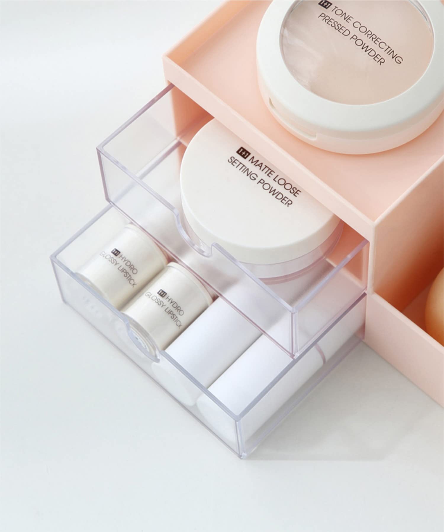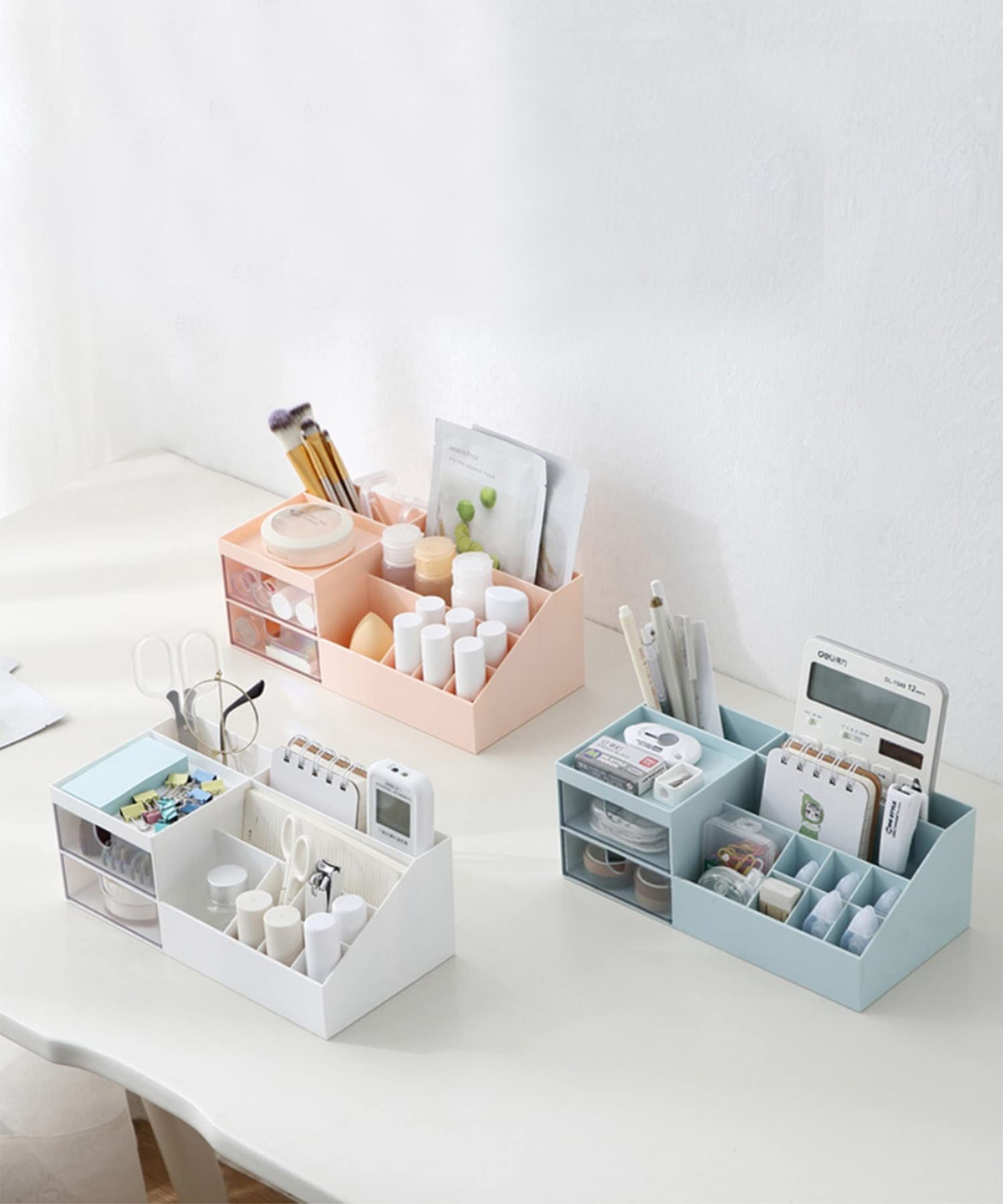 メイクグッズだって、文房具だって収納できる引き出しボックス。 インテリアにもマッチする可愛い3カラーです。 デスクの小物の収納に、ご自宅でもオフィスでも◎