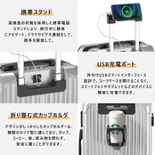 【USBポート+飲料スタンド+携帯スタンド多機能キャリーケース】①USB充電ポートを備え、いつでも電子機器を充電できる。②スーツケースの背面には折りたたみ可能なカップホルダーが設置されており、飲み物、ボトル、カップ、傘などを簡単に取り出して入れることができます。③スーツケースのハンドルにはスマホスタンドが付いており、動画やビデオ通話を見たり、両手を解放したりするのに便利です。