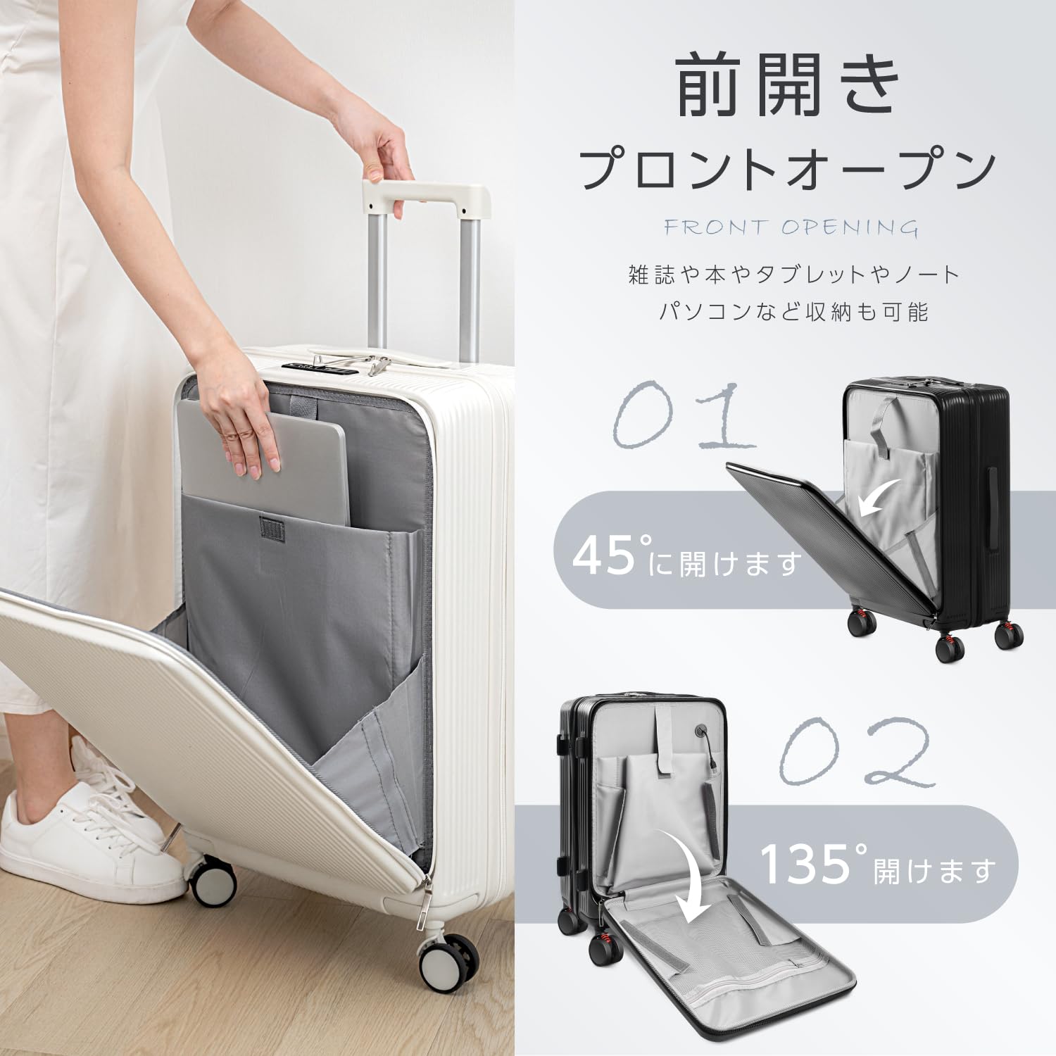 【最新登場&フロントオープン】新型スーツケースはフロントオープン型で、立てたまま荷物の出し入れができるので便利です。空港や電車内、移動中で荷物を出し入れしやすいです。PC用ポケット「サイズ:31*32cm」で15インチまでのパソコン、タブレット、書類などが収納できます。容量:約41L 重量:4.3 kg 機内持ち込みOKSサイズ:57*26*38