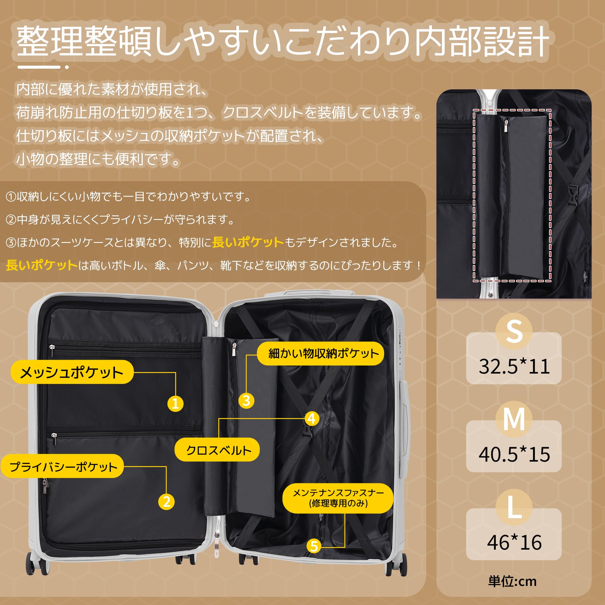 【商品仕様】※S size:外寸:約55×40×20cm 内寸:約45×38×20cm 本体重量:約2.87KG 、1~3泊に似合い。Sサイズは機内持込が可能なスーツケースです。飛行機内だけでなく、一人旅行や故郷帰りの新幹線やバスなどの車内移動も便利なスーツケースです。※M size:外寸:68×43×24.5cm 内寸:約60×40×24.5cm 本体重量:約3.9KG、4-7泊以上 。※L size:外寸:約77×49×29cm 内寸:約68×47×29cm 本体重量:約4.5KG、7泊以上。