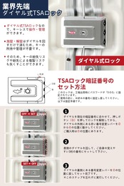 【TSAロックで安全性と便利さを提供】安全性を重視して、TSAロックを搭載しています。TSAロックは、アメリカの税関向けに特別に設計されており、TSAの係官が鍵を壊すことなく荷物を検査できるため、安全で便利です。長距離の旅行でも短期の旅行でも、大切なものをしっかりと守りながら、簡単に開け閉めできます。※TSAロック用のカギは付属しておりません。鍵は、TSAの係官が所有する特別なものです。お客様のロック方法は、3桁の番号を合わせるダイヤルロックです。