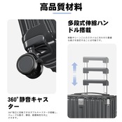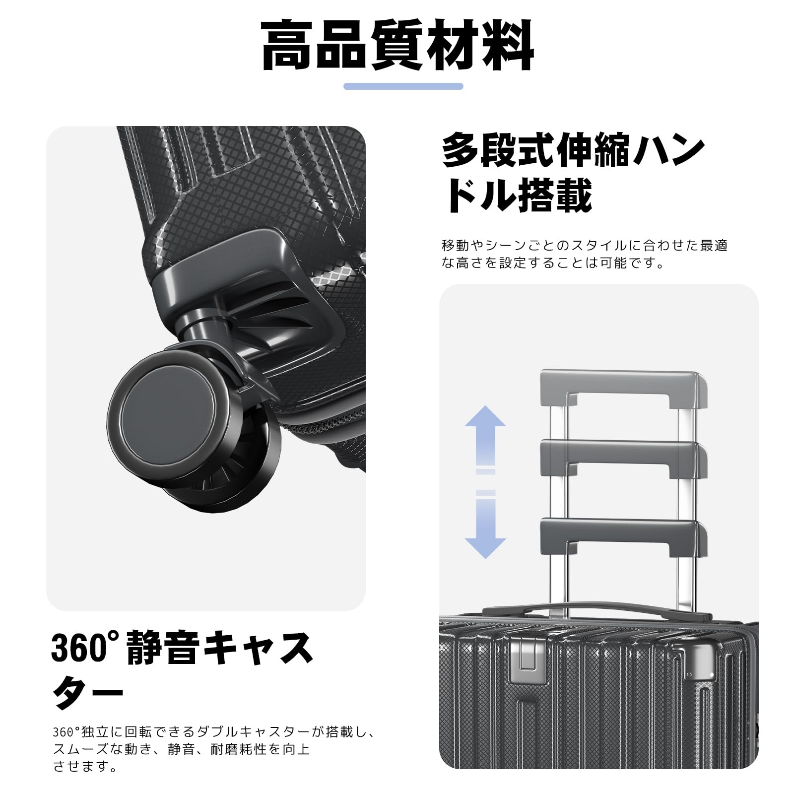 【360°静音キャスター・快適な弾性ハンドル】360°独立に回転できるダブルキャスターが搭載し、スムーズな動き、静音、耐磨耗性を向上させます。また、スーツケースにはシリコンソフトハンドルが2つ付属しています,人間工学に基づいた設計、柔らかくて握りやさしい、長時間持っても疲れにくい。