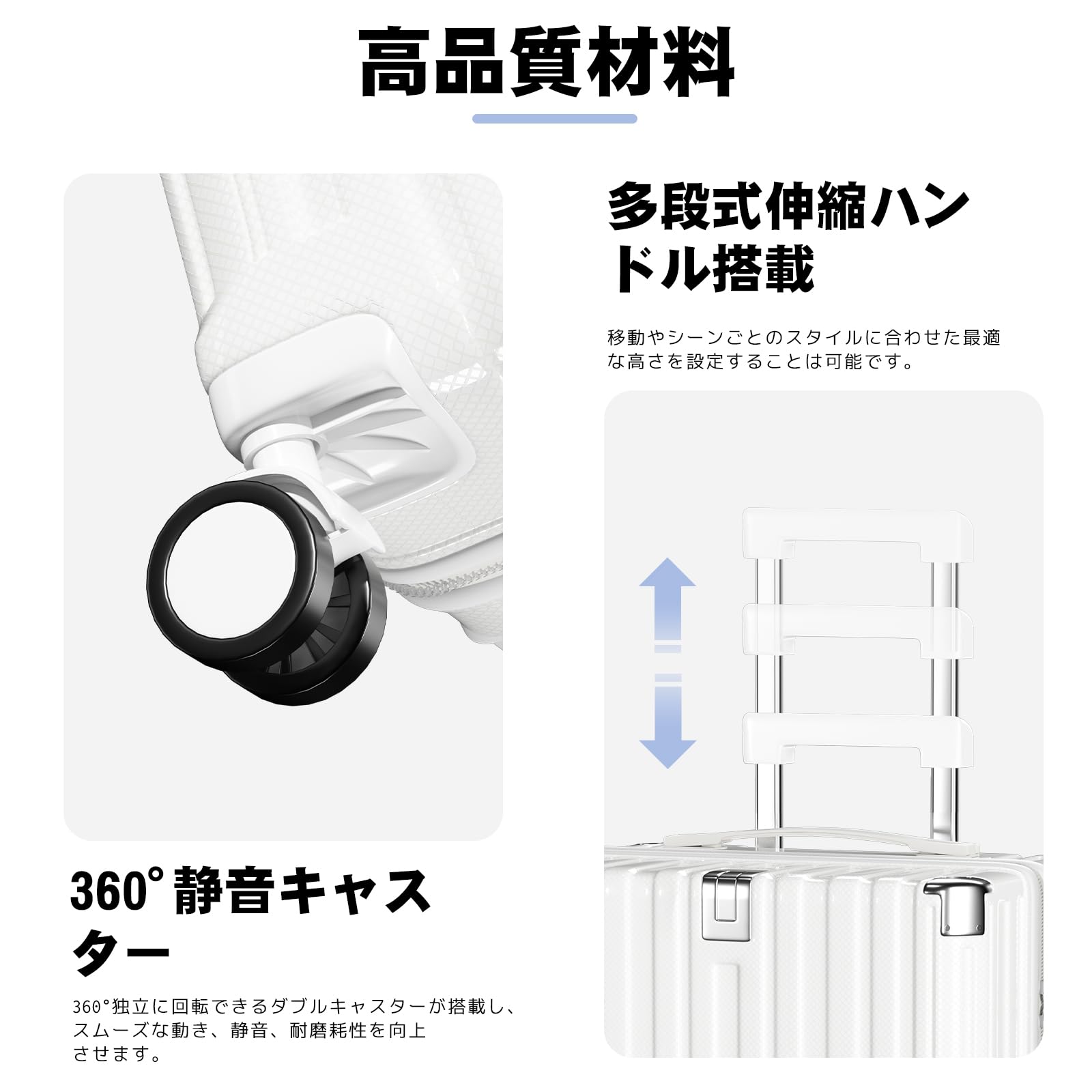 【360°静音キャスター・快適な弾性ハンドル】360°独立に回転できるダブルキャスターが搭載し、スムーズな動き、静音、耐磨耗性を向上させます。また、スーツケースにはシリコンソフトハンドルが2つ付属しています,人間工学に基づいた設計、柔らかくて握りやさしい、長時間持っても疲れにくい。