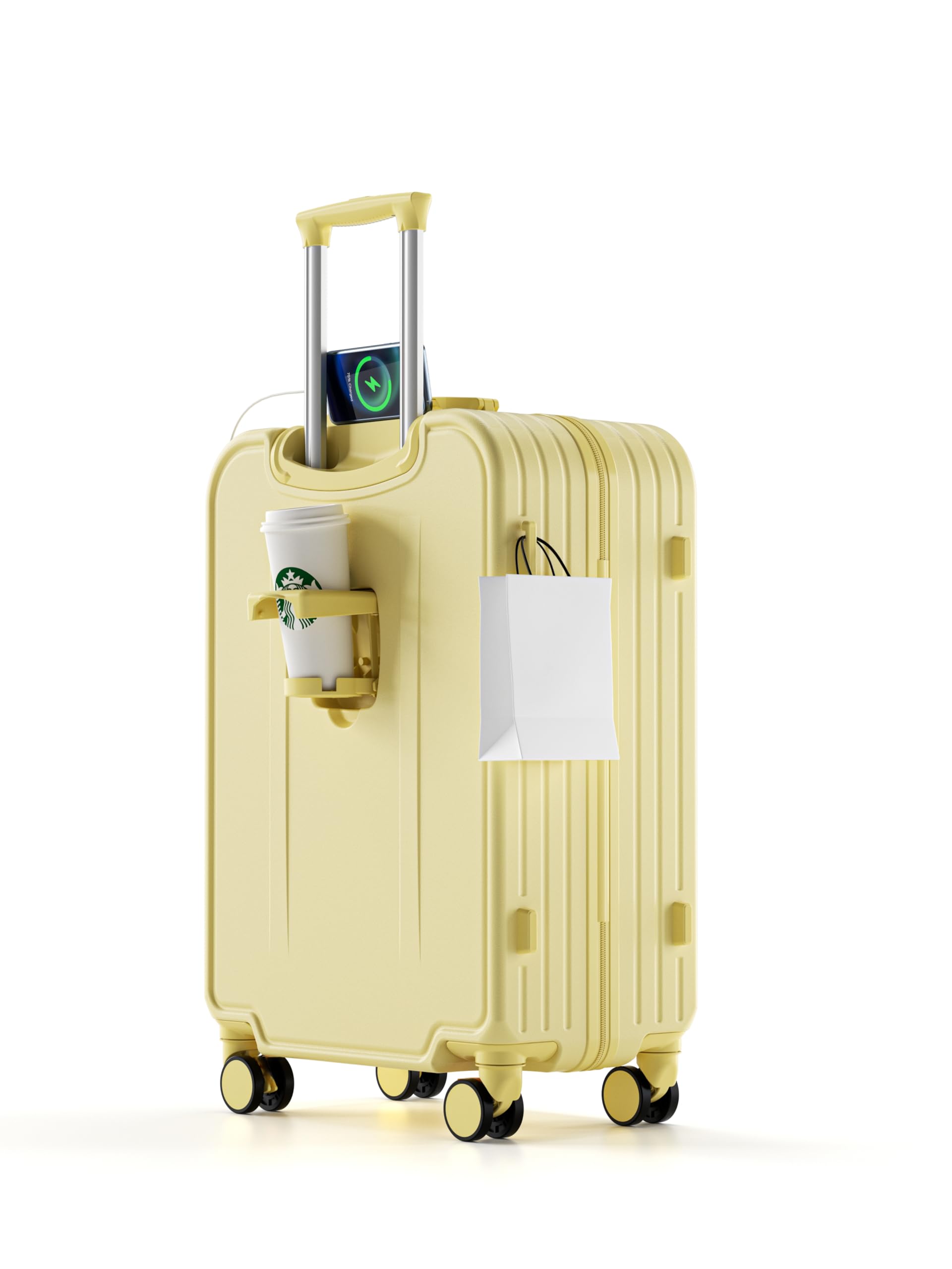 【スーツケース 機内持ち込み・USB充電ポートと折りたたみ式カップホルダー付き】スーツケースにはUSB充電ポートが付いており、いつでもどこでも充電できます。さらに、便利なカップホルダーが付いており、水筒、コーヒーカップ、その他の飲料容器を置くのに便利です。多機能のデザインと使いやすさが魅力です。