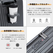 【多機能・USB+Type C充電ポート付き ・カップホルダーとスマホルダーを付く】スーツケースにモバイルバッテリーを収納するポケットがついており、 USB+Type Cポートの充電口が外にあることで、いつでもどこでも充電できます。便利な折りたたみ式ドリンクホルダー付き。バックカップホルダー、ミルクティーカップ、傘いつでも配置でき、旅行をより便利にすることができます。レバーの上部にはスマホルダーが付いているので、フライトの待ち時間に両手が自由になり、外出先でもリラックスできます。