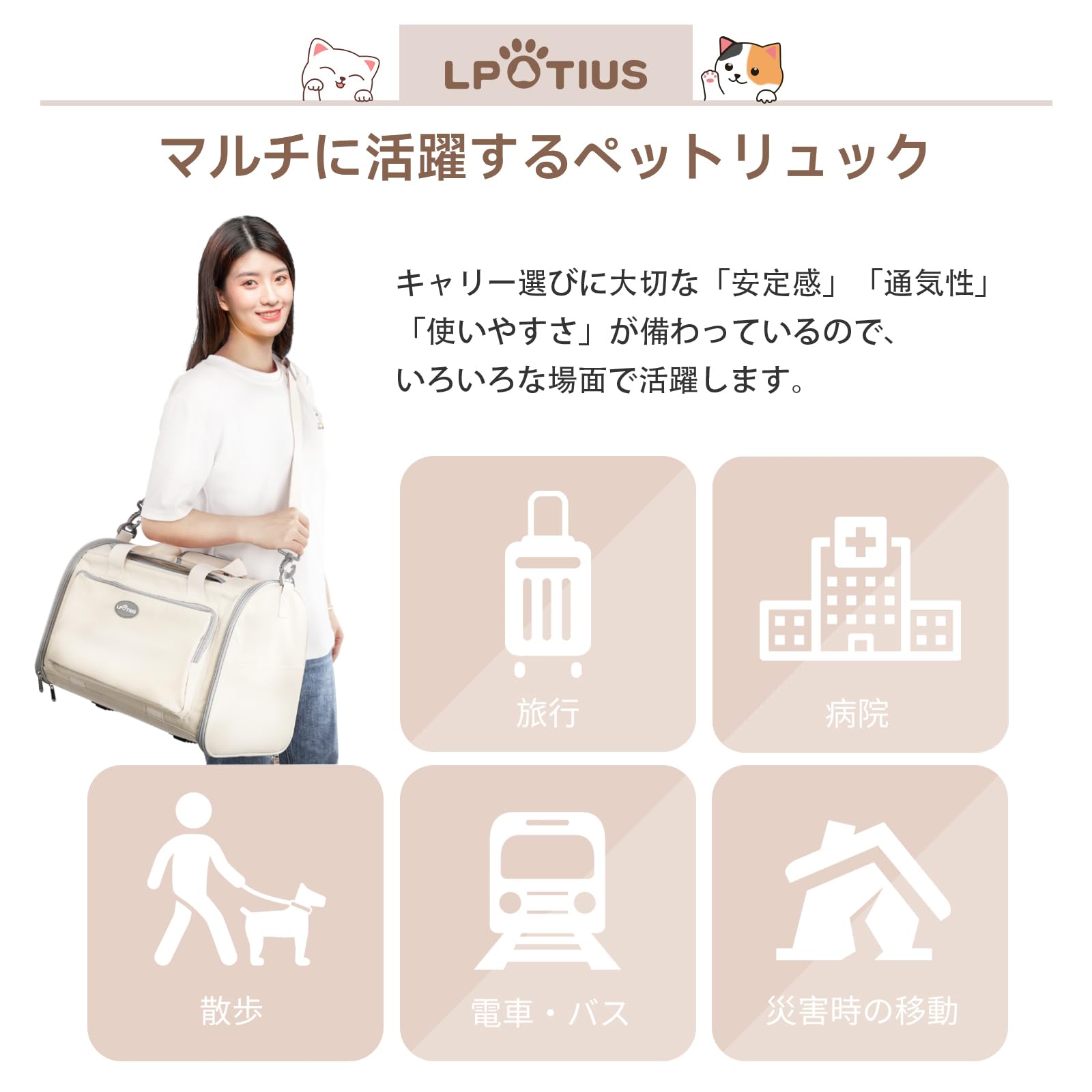 【数量限定】LPOTIUS ペットキャリー バッグ 折り畳み 2way 猫 小型犬 キャリーバッグ 軽量 3面通気 洗える 猫 キャリー 犬用キャリーバック 飛び出し防止リード付き ペット用 キャリーケース ベルト脱着可能 お出かけ 車載 旅行 通院 電車移動 災害避難に最適 耐荷重8KG (エクリュ) | allureshop