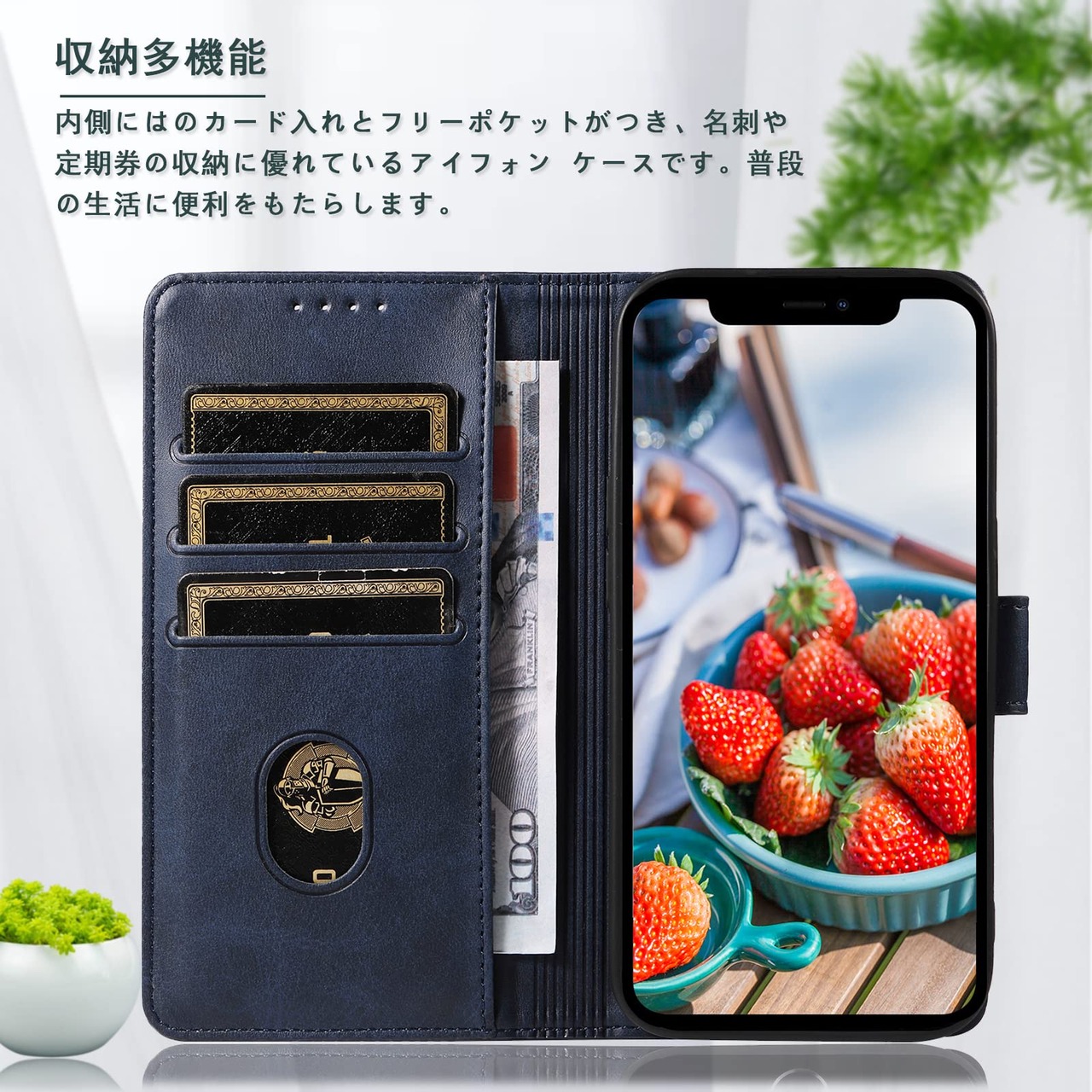 【カード収納】:アイフォン 手帳型ケースの内側にはカード入れのポケットが付くため、カード類や紙幣 、名刺、免許証などを入れることができ、日常の生活に便利です。なお、入れすぎるとふたが閉じづらくなりますので、ご注意くださいませ。