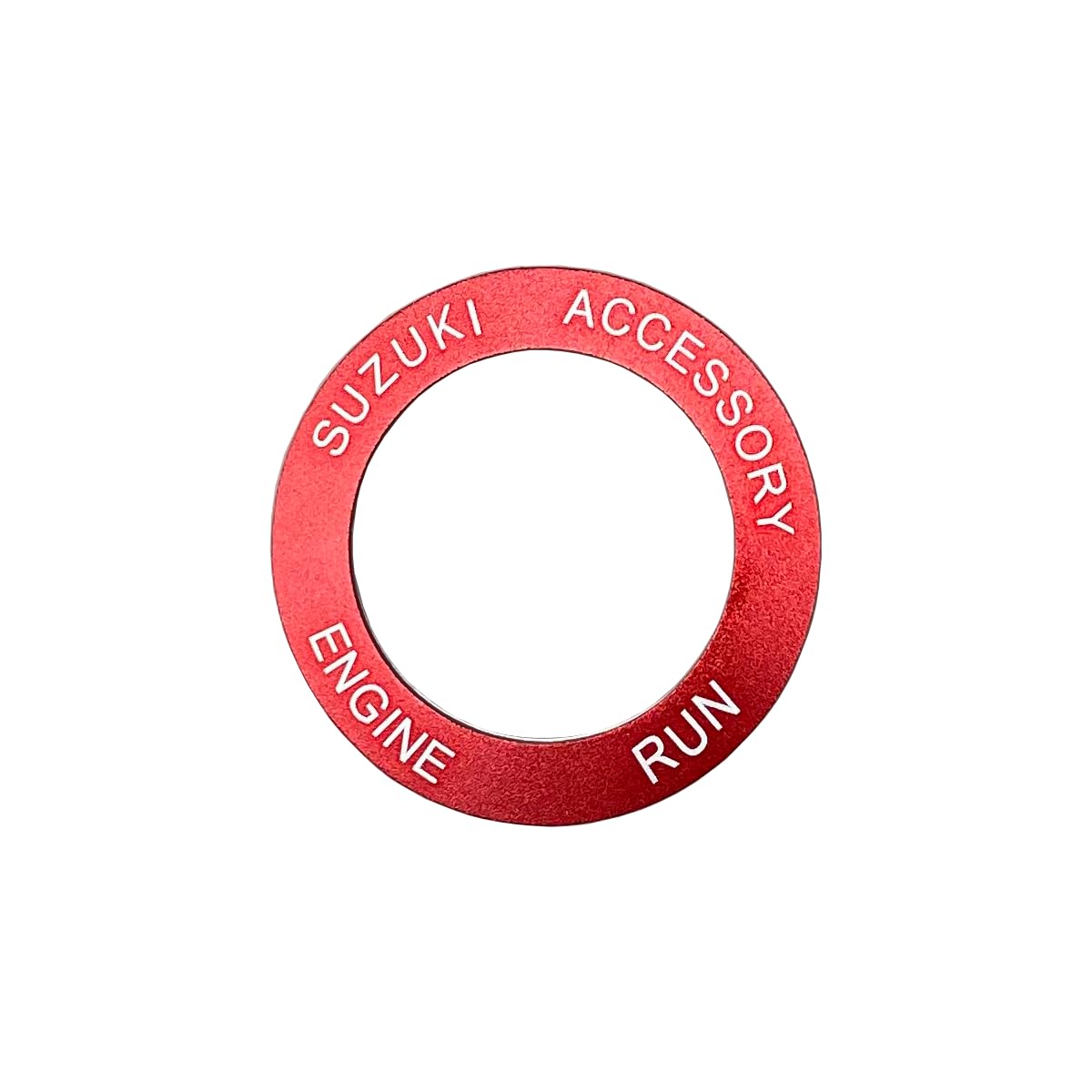 車のエンジンスタートボタン回りに取り付けるリング型のアクセサリーです。スタートスイッチをスタイリッシュにドレスアップしてくれるインテリアです。 アルミ合金で出来ているため高級感があり腐食にも強く耐久性に優れています。 ジムニー・エスクード・クロスビー・スイフト・SX4・アルトワークス ・ハスラー ・ワゴンRなどのスズキ車に対応しています。 設置方法はお使いの場所を中性洗剤や脱脂シートによりほこりや脂分をキレイに取り除き、リングの裏面の両面テープのシートを剥がしてしっかりと取り付けてください。