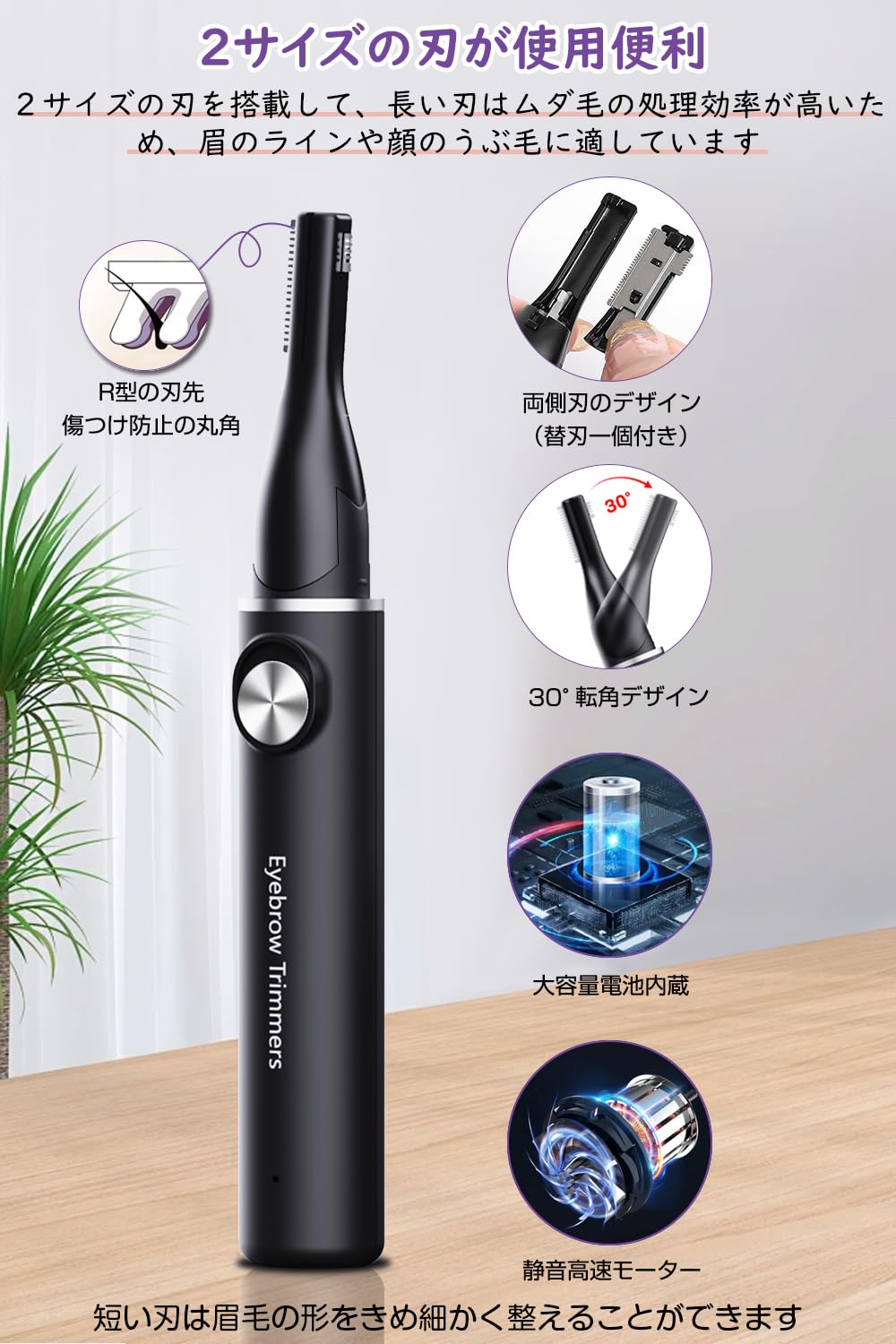 【耐久性抜群・1台多役】本体は耐久性よいABS樹脂と精鋼ステンレスを使用し、環境にも優しいです。便利な替刃式デザイン、替刃も付き、もっと長くお使いいただけます。眉毛だけではなく、この電気シェーバーは全身適用です。頬・腕・足・腋・もみあげなど顔や体のむだ毛にも使えます。ムダ毛の悩みから解決させるオススメの好物です。体も顔も1台でケアできちゃいます。この眉シェーバーは、友人、上司、同僚、彼女へのプレゼントとして最適です。