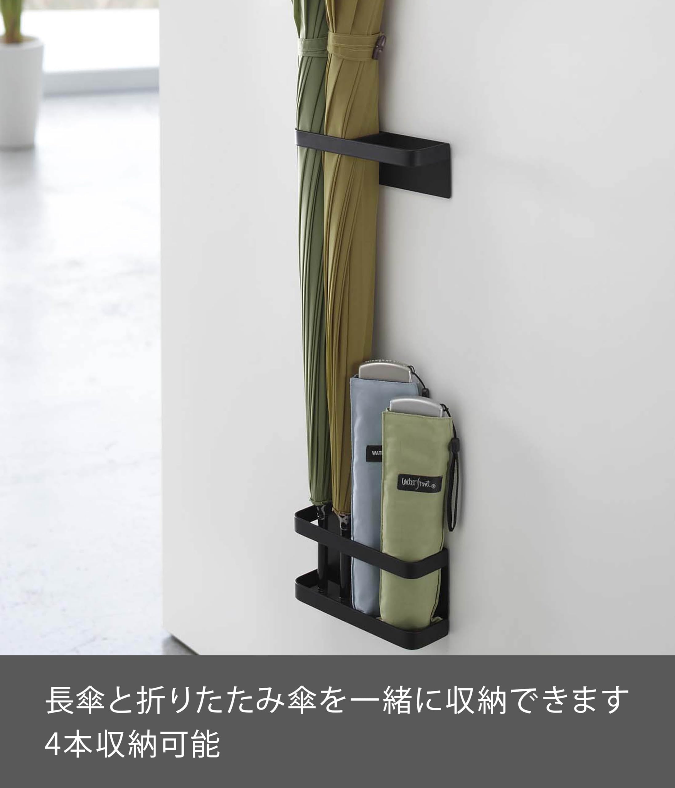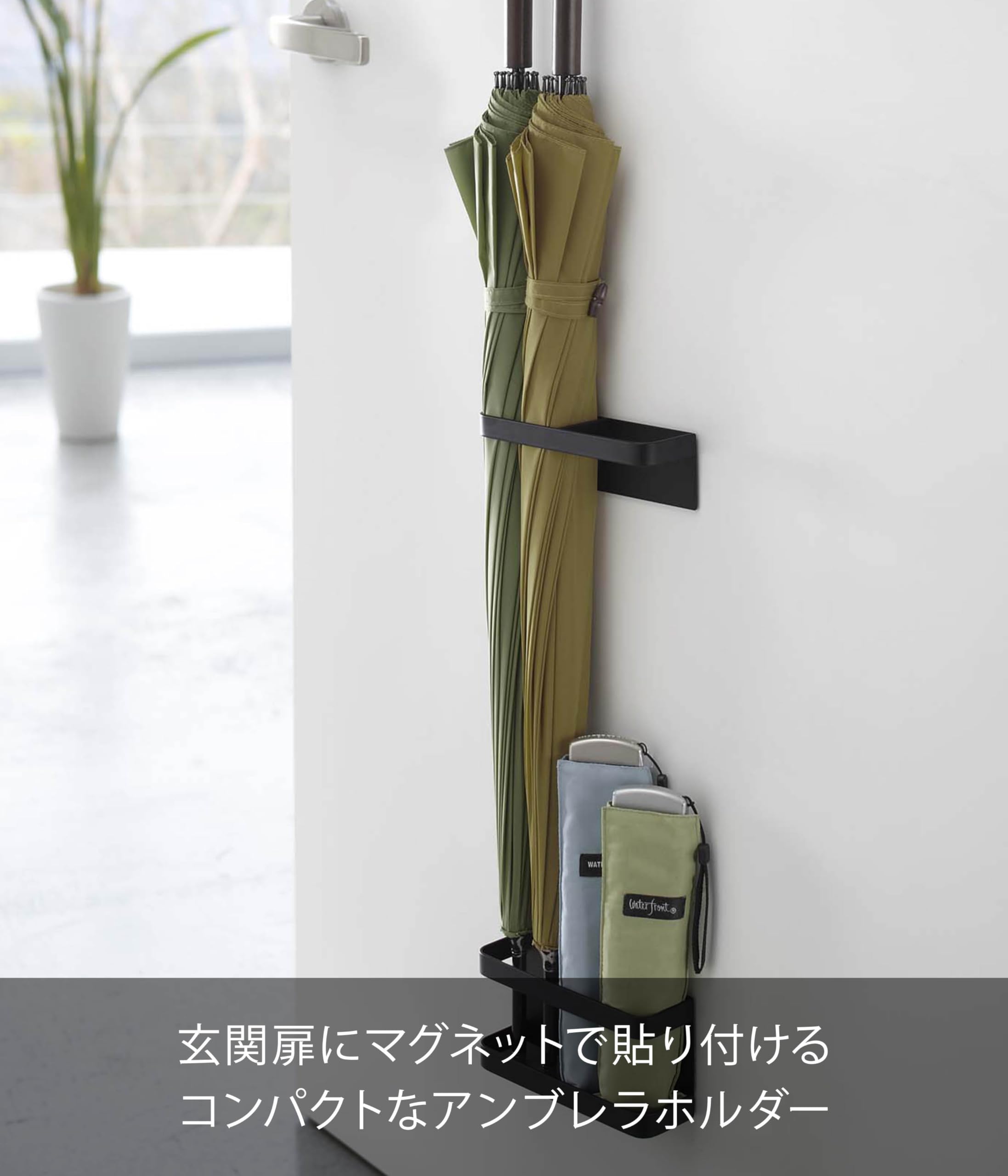 マンションの鉄製扉など、磁石のくっつくあらゆる場所に取り付け可能。下ホルダーは仕切りを利用して折り畳み傘を収納可能。ドアがコンパクトな傘の収納スペースに! 強力磁石で取り付け自在!