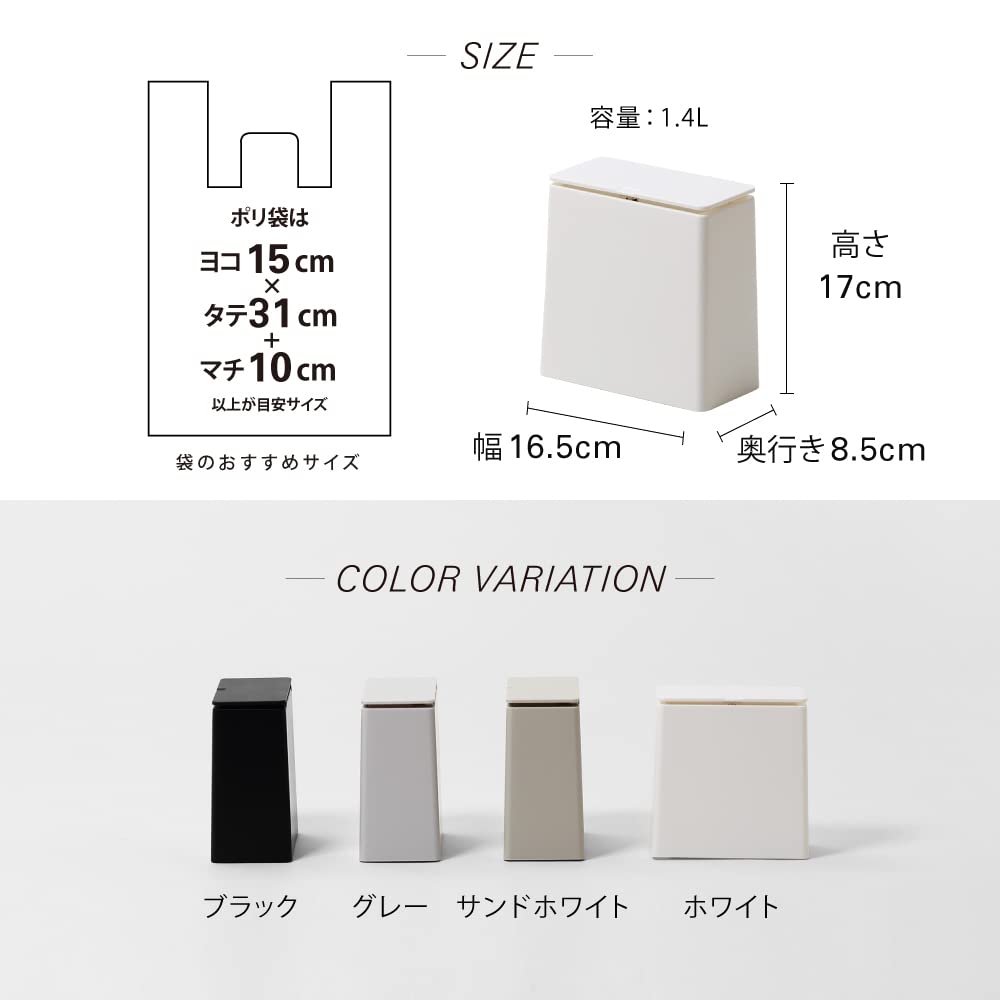 キッチンや卓上に最適なコンパクトサイズのフタ付きゴミ箱チューブラーシリーズの最大の特徴ともいえるゴミ箱本体をスッポリと覆う大きなカバー。いやな臭いも、見た目の悪いゴミ袋もすっきりキレイに隠してくれます。セットは簡単で、ゴミ捨ても楽!ピッタリと閉まるフタは、ワンプッシュで簡単に開閉できるので何かと忙しいキッチンには嬉しい設計です。キッチンの生ゴミはもちろん、洗面所やドレッサーの上でコットンやティッシュを捨てたり、狭い卓上スペースにもぴったりなサイズ。片手で持ち上げられるので、移動も簡単です。スッキリした長方形のカタチがシーンを選ばず、いろいろな場所で活躍してくれます。
