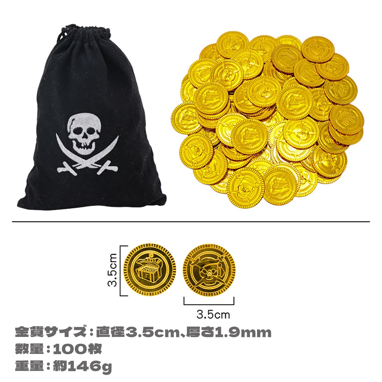 【製品仕様】本製品には異なる数量のゲーム用コインが含まれています。単体のサイズは3.5*0.2cmで、カラー:ゴールド。